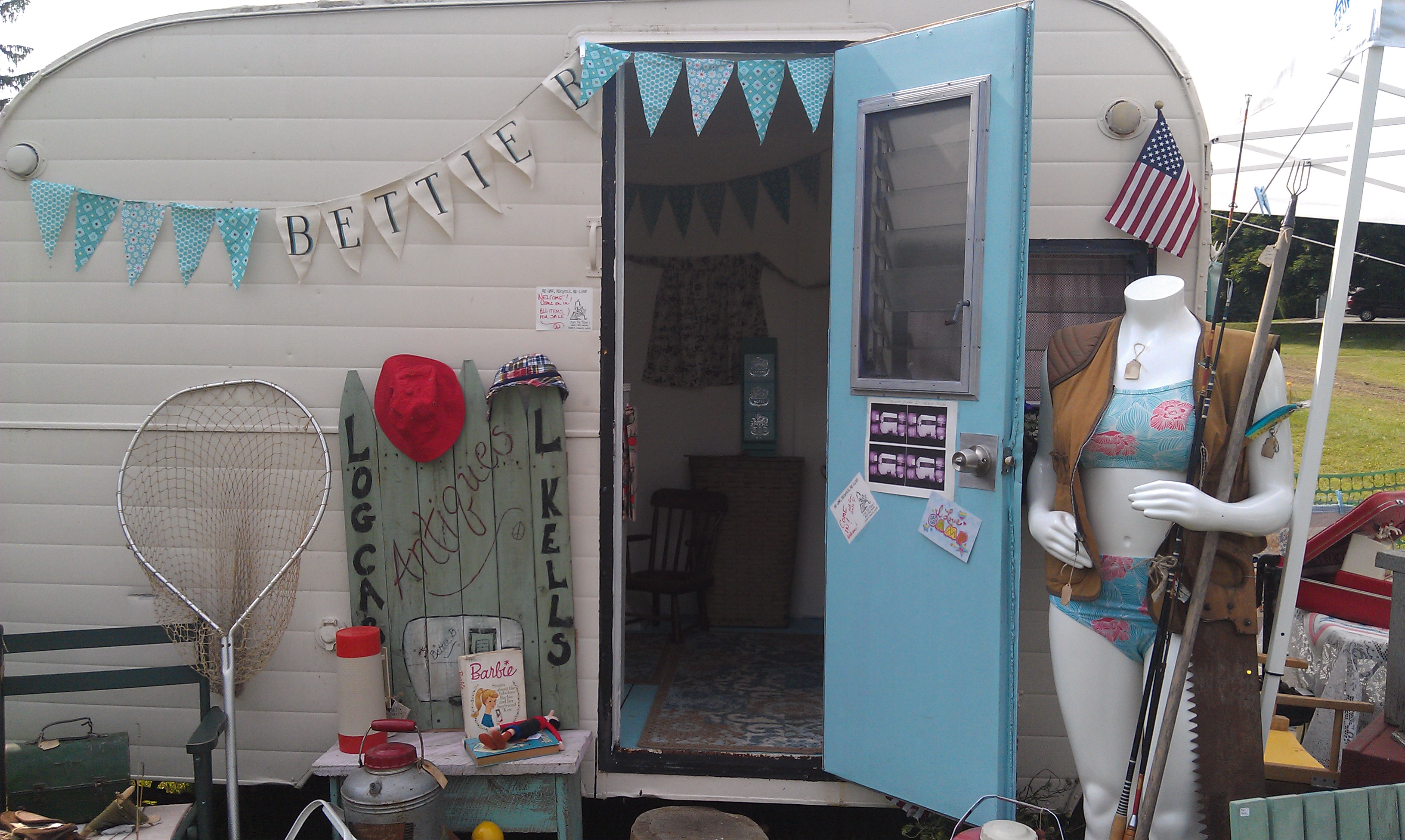 The work of L Kells Antiques  and Log Cabin Antiques, I have been following Bettie B’s transformation every step of the way on Facebook and the final result did not disappoint! It was so cute, all decked out with vintage awesomeness and colorful kitsch. Unfortunately she was already sold, but I did scoop up this awesome mini minnow bucket.  It looks great on the larger one I purchased last summer, situated right next to my vintage tackle box and lures.